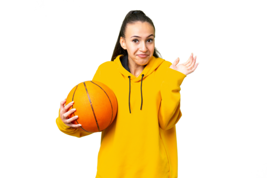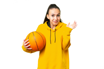 Young Woman playing basketball over isolated chroma key background having doubts while raising hands