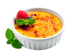 A delicious creme brulee dessert in a white ramekin on transparent background