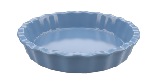 Empty light blue ceramic ramekin dish with fluted sides on a black background