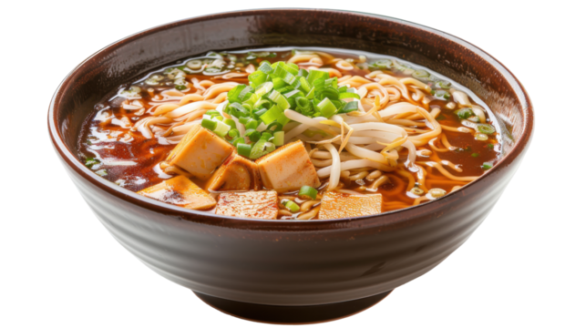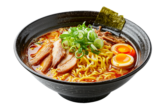 Delicious ramen bowl with noodles, meat, egg, and green onions, isolated on transparent cutout background