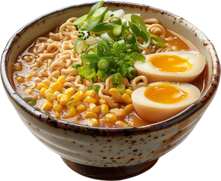 Delicious bowl of ramen noodles with eggs, corn, and green onions in a ceramic bowl on a white background.