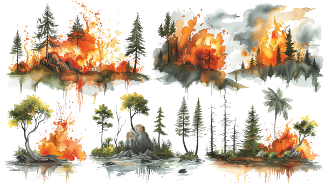 Firefighters battle a massive wildfire that has engulfed a forest. The flames are spreading quickly, and the firefighters are working hard to contain the blaze.
