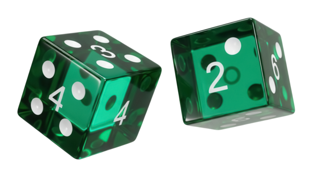 Two green dice PNG isolated on transparent background, gambling game equipment for board games and decision making, random number generator