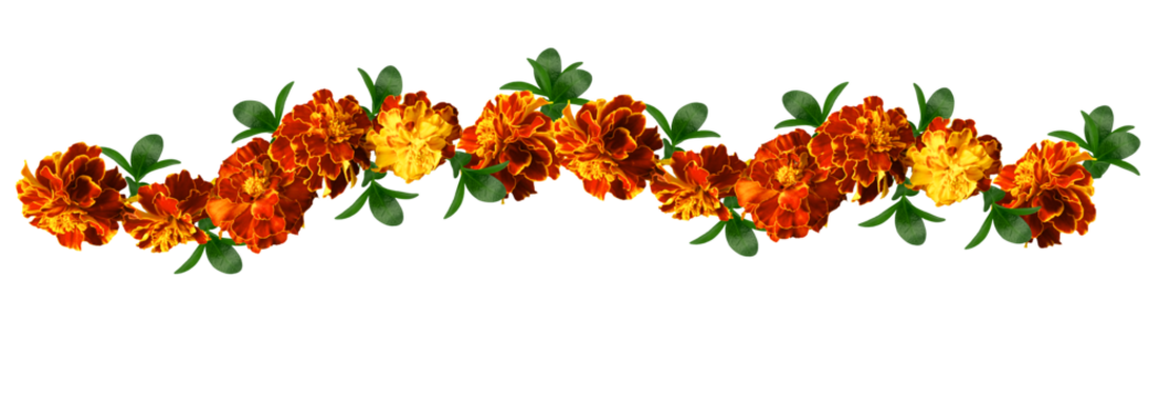 isolated garlands of flowers.  Marigold Diwali. Indian flower door garland of leaves and marigold flowers. marriage, festivals traditional.
