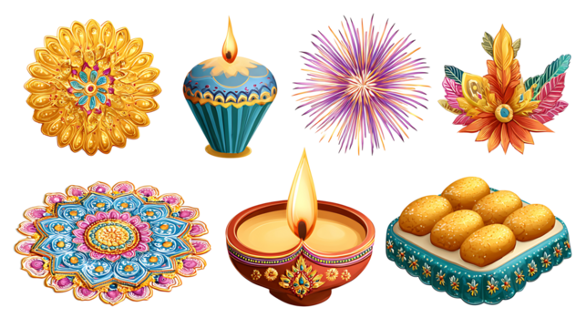 Diwali celebration objects: diyas, fireworks, sweets, and rangoli, isolated on white background