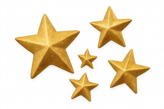 Gold glittering stars with five points, sparkling decoration for celebrations, awards, and holidays, transparent background