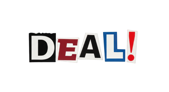Colorful DEAL Ransom Note Style Cutout Letters on White.