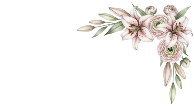 Luxury watercolor corner element featuring lilies and ranunculus in a neutral color palette isolated on white background