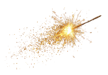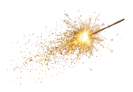 A sparkler explodes in a burst of golden light against a black background.  Sparkling particles radiate outward from a burning stick
