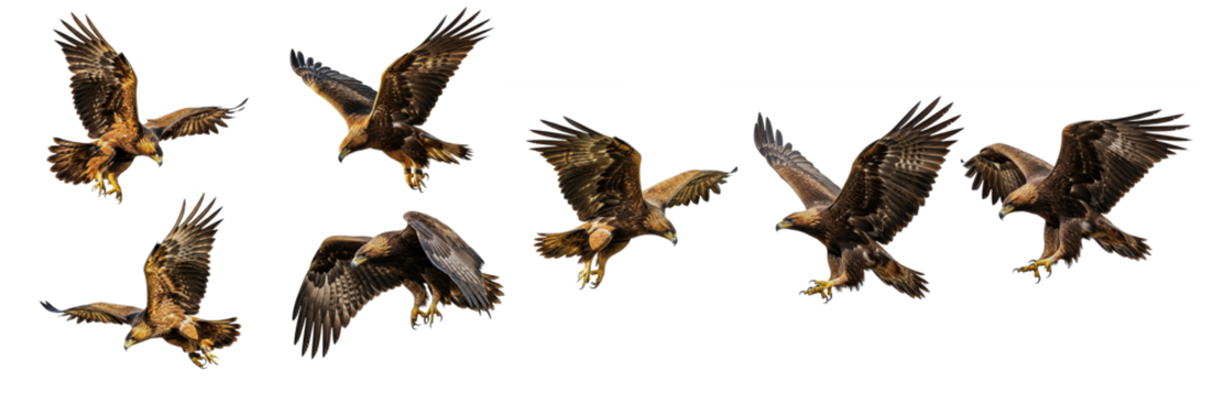 Golden Eagle Aquila chrysaetos isolated on white, seven birds flying diving landing wings spread predator collection wildlife nature raptor bird set collage