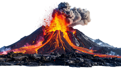 Fiery volcano erupting with lava and smoke isolated on transparent background