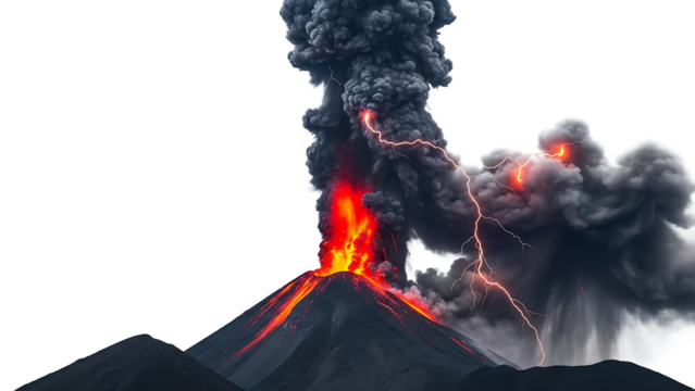 Volcanic eruption with lightning on transparent background