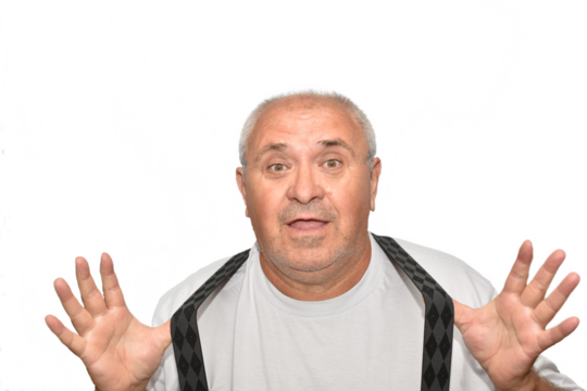 The picture shows a man who looks joyful. He pulls down his suspenders with his fingers.