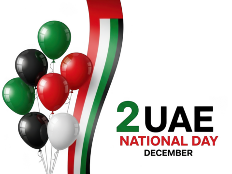 Uae national day celebration graphic with colorful balloons and ribbon featuring national colors, isolated on transparent background