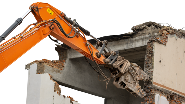 A heavy-duty excavator demolition machine is actively tearing down a concrete wall at a construction site. Debris and rubble scatter around as the machinery works efficiently.