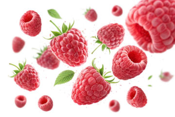 Flying falling raspberries isolated on transparent or white background, png
