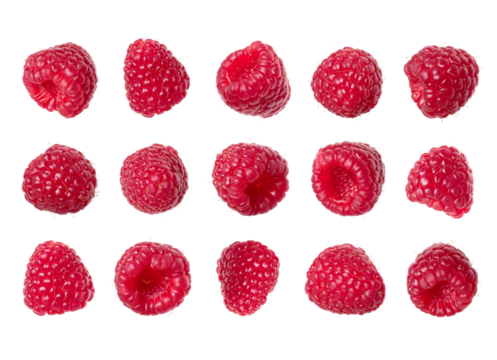 Close Up To a Set of Flying or floating Fresh Red raspberries PNG isolated on white and transparent background - Ripe Raspberry Healthy fruit For Juice Drinking Concept