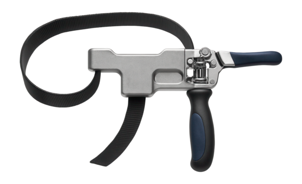 Band clamp with a flexible nylon strap and ratchet mechanism for irregular shapes.