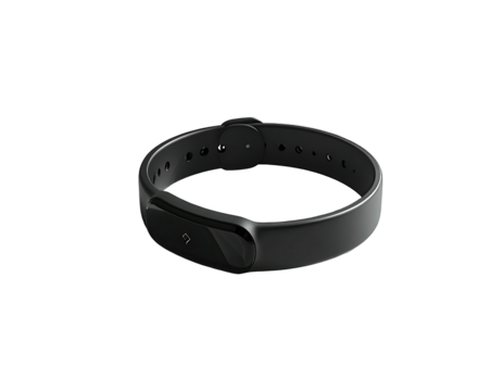 Sleek, matte-black fitness tracker with a minimalist design, featuring a curved rectangular display and perforated band