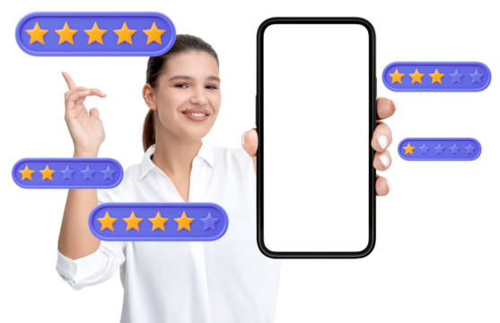 Businesswoman holding a smartphone with rating stars icons on a transparent white background. Concept of customer feedback and satisfaction