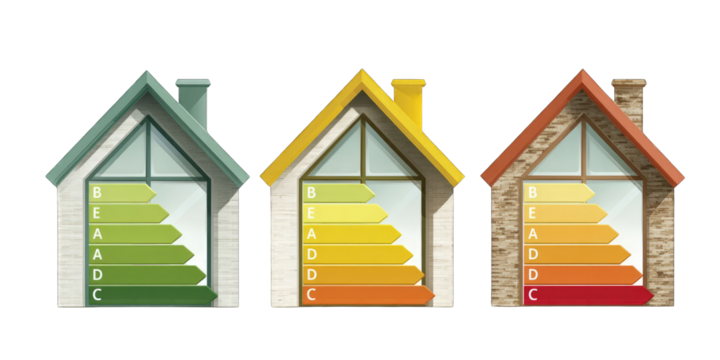 Three houses with varying energy efficiency ratings
