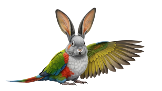 Detailed Digital Illustration of a Hybrid Rabbit and Colorful Parrot Mythological Creature isolated PNG with Transparent Background