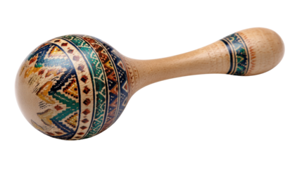 Wooden maraca creating music with traditional tribal patterns, a percussion instrument with transparent background