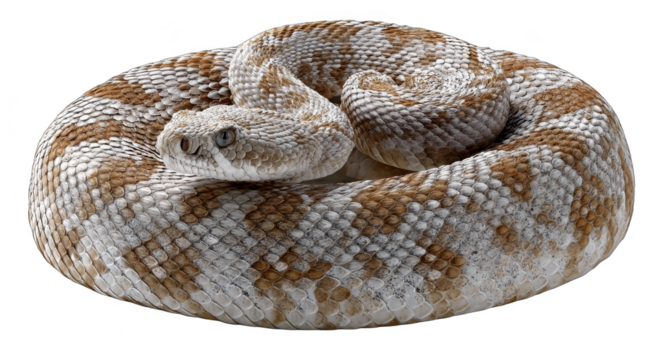 A coiled rattlesnake with intricate scale patterns, isolated on transparent background