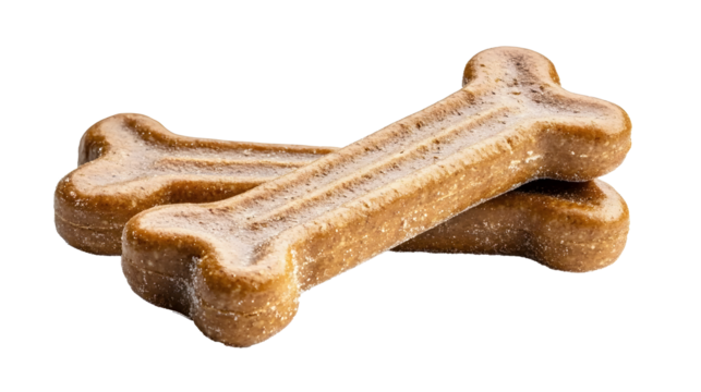 Two delicious dog bone shaped treats, stacked crosswise, isolated on a transparent background, creating a fun and playful composition for pet-themed designs.