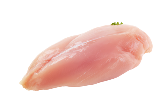 Close up of a single raw chicken breast with a small green garnish on top against a black background on transparent background