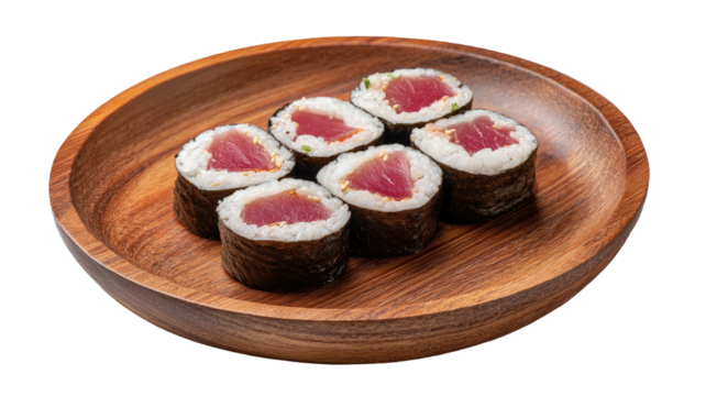 Tuna rolls on wood plate rice, nori, & deep red tuna inside