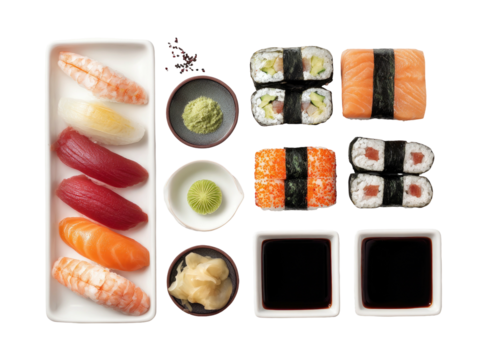 Sushi arrangement nigiri, rolls, wasabi, ginger, soy sauce, and garnish