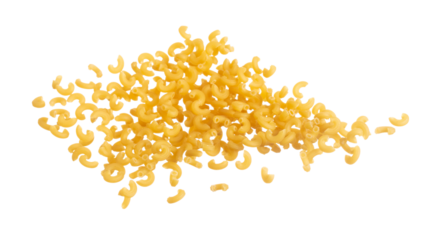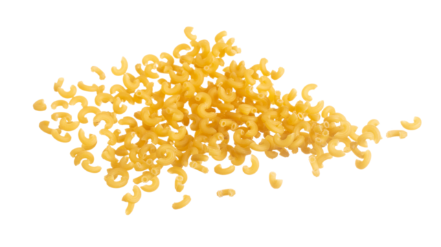 Macaroni flying explosion, yellow macaronis pasta float explode, abstract cloud fly. Curved macaroni pasta splash throwing in Air. White background Isolated high speed shutter, freeze motion