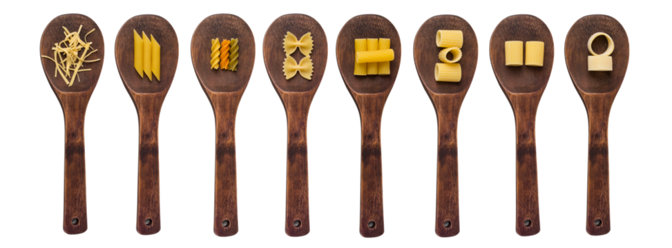 Wooden cooking spoons filled with various types dry pasta. PNG file