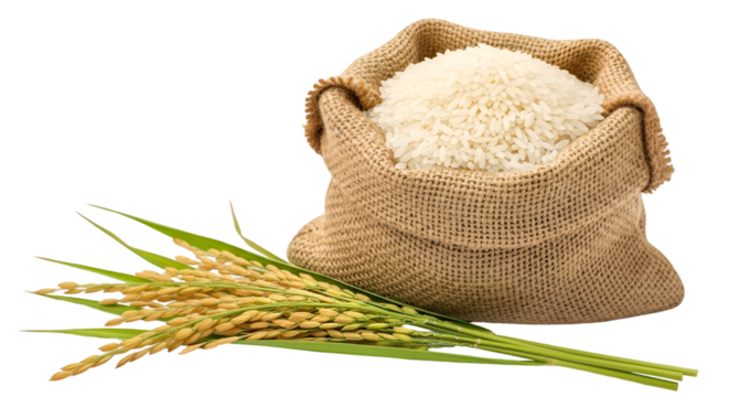 Burlap Sack Full of White Rice with Rice Stalks food