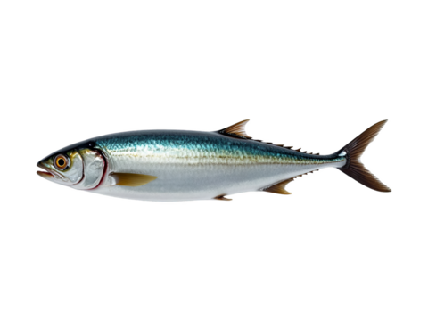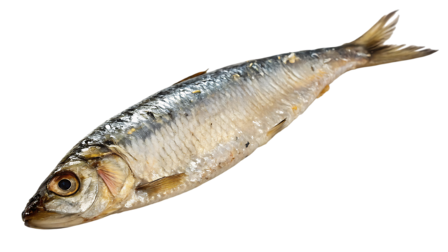 Fresh sardine fish with detailed scales and fins isolated on white transparent background, symbolizing canned seafood