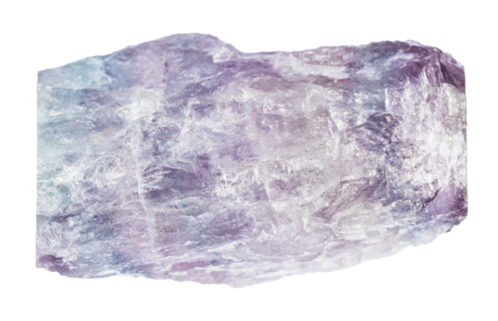 close up of sample of natural stone from geological collection - raw purple striped fluorite mineral isolated on white background