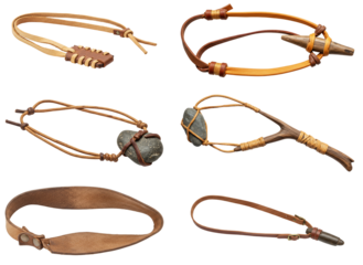 Set of primitive slings with braided rawhide and stone holders on transparent background