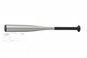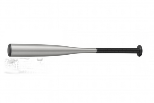 Horizontal close-up of a silver baseball bat with a black handle, isolated on a transparent background, ideal for sports-themed projects