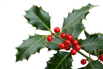 close up of holly leaves with re berrie isolated on white background, png, ai generated.