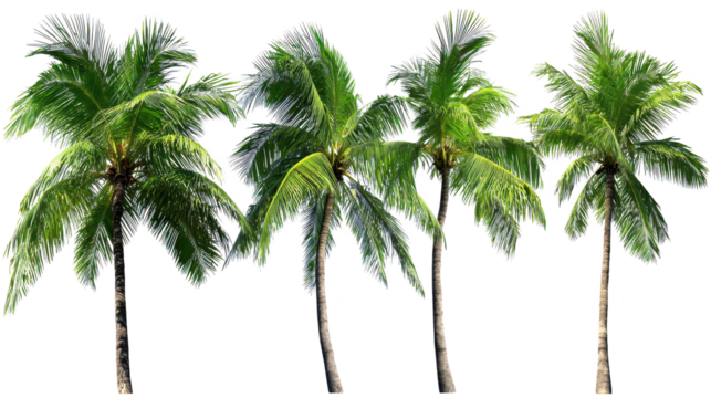 Palm tree with green fronds and curved trunk, reaching towards the sky, tropical plant on a transparent background
