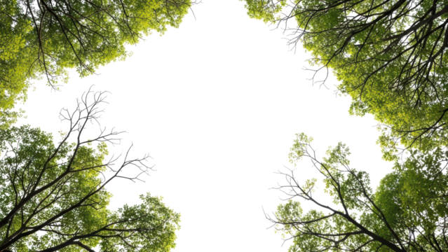 Lush green tree branches with vibrant leaves reaching upward toward the sky isolated on a transparent background