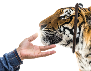 Close-up profile of a tiger's head with an outstretched hand reaching towards it, set against a black background