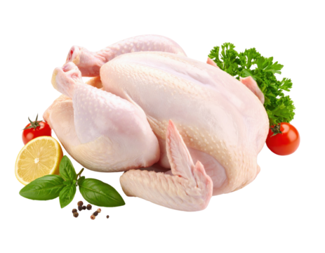 A raw whole chicken meticulously arranged with fresh parsley, basil, cherry tomatoes, and a lemon slice, highlighting its readiness for healthy culinary preparation.