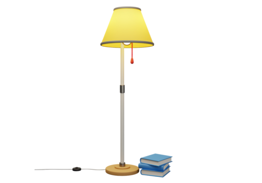 Modern curved floor lamp with adjustable head and brass accents isolated on transparent background