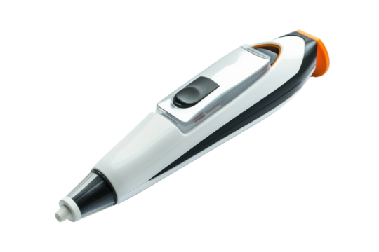 Highly detailed charcoal-grey synthetic hand precisely gripping a sleek, matte obsidian optical scanner with glowing cerulean readouts on a transparent background, Concept of advanced bio-data