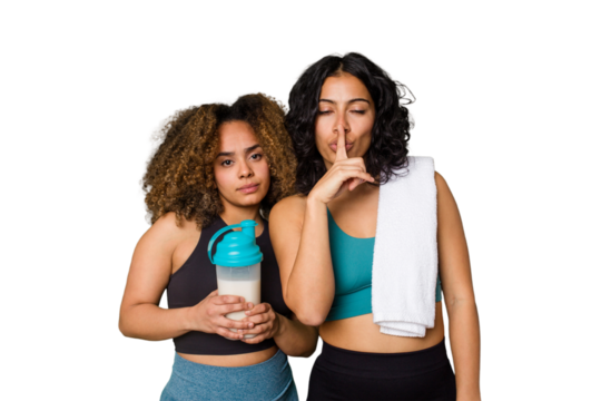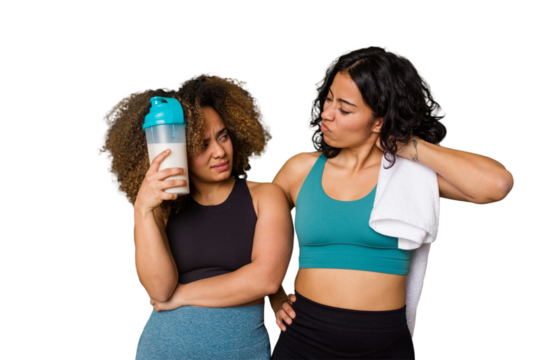 Two best friends are ready to go to the gym, one of them holds a protein shake, showing a disappointment gesture with forefinger.