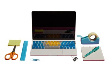 Modern workspace setup with laptop, stationary, and colorful keyboard, perfect for business, design, and creative projects ready to start