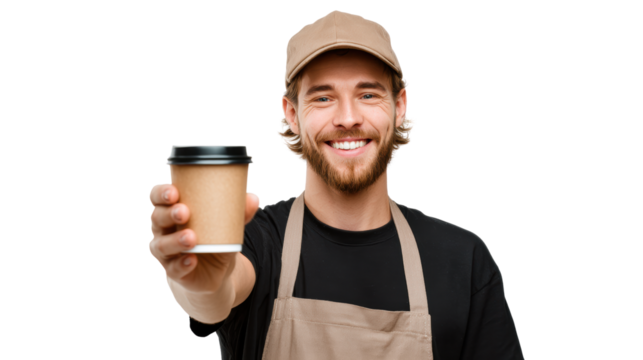 Happy barista with a coffee cup, smiling confidently against a white background.