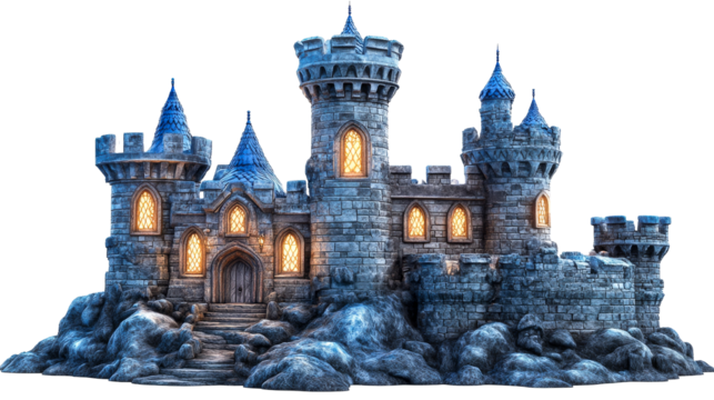 Fantasy kingdom stronghold edifice with spires, cut out transparent